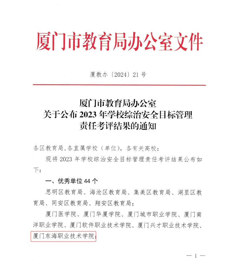 喜报!厦门东海职业技术学院荣获2023年度综治优秀单位称号