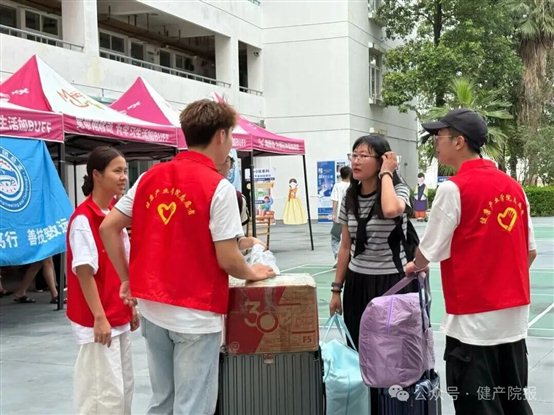清晨七点半,校园还浸在夏末的微凉里,教学楼边的迎新帐篷已支起了属于健康产业学院团总支的旗子。志愿者们穿着统一的红色马甲,正忙着把椅子与桌子搬到帐篷下供新生和家长休息——这是迎新日的序幕,每一个忙碌的身影,都在等一群带着期待而来的人。