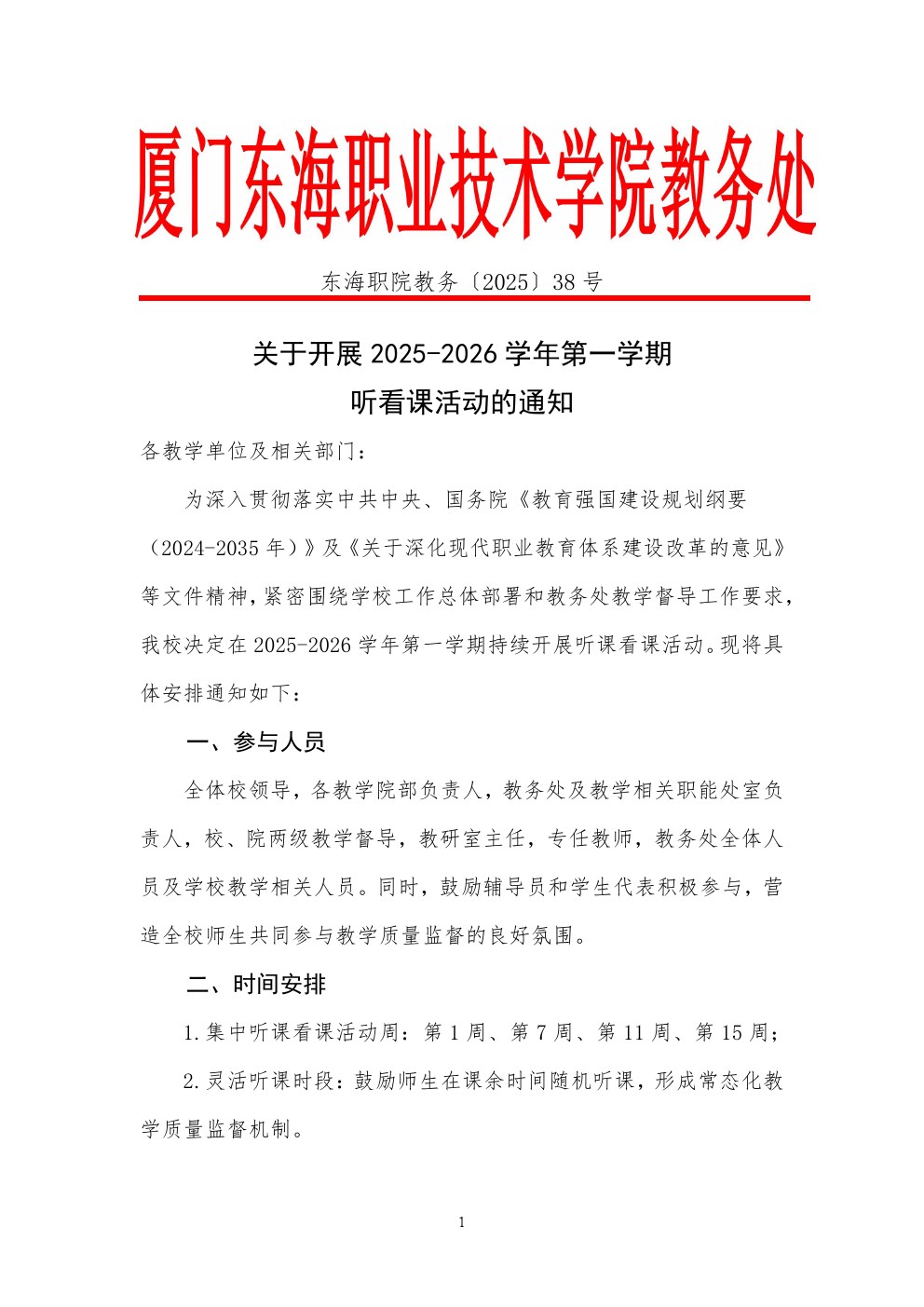 东海职院教务〔2025〕38号关于开展2025-2026学年第一学期听看课活动的通知